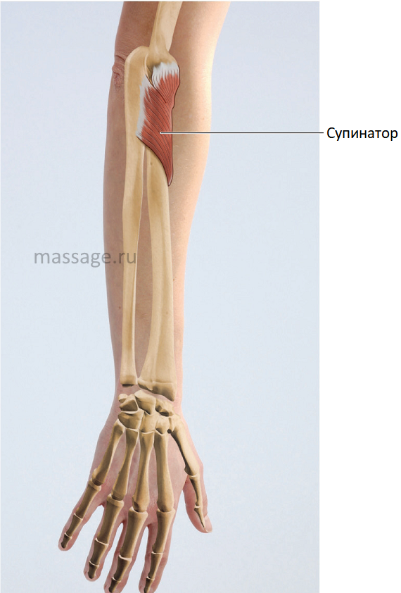 Супинатор – это мышца предплечья задней группы, расположенная глубоко на проксимальном конце предплечья. Она залегает глубоко под плечелучевой мышцей и общим разгибателем пальцев у латерального надмыщелка плечевой кости.