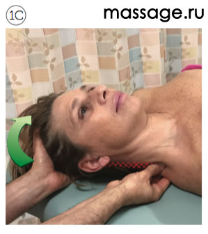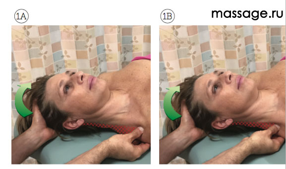 На рис. 1А - 1С показана техника точечного растягивания мышц шеи (цервикокраниальной фасции), где в качестве фиксационной точки используется правая трапециевидная мышца, а именно – место крепления лопаточно-ключичной фасции.