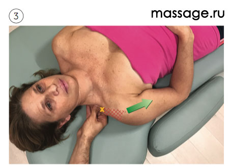 Если оба крепления мышцы к кости достаточно подвижны, фокус приложения силы можно создавать на любом из креплений. В первом примере (Рис. 1А-1С), сила растягивания была сфокусирована на месте крепления цервикокраниальной фасции. Если область гипертонуса мышц была бы расположена на месте крепления лопаточно-ключичной фасции, мы бы расположили фокус приложения силы как можно ближе к этой области, но с другой стороны, в этом случае – со стороны крепления цервикокраниальной фасции, и затем растягивали бы место крепления лопаточно-ключичной фасции по направлению от шеи клиента (Рис.3). К сожалению, чаще всего лишь одно из фасциальных креплений мышц достаточно подвижно, и зачастую это дистальное (удаленное от центра тела) крепление фасции. Именно поэтому целесообразно применять точечную технику для растягивания той области мышцы, которая находится ближе к более подвижному креплению. Два примера продемонстрированы на рис. 4 и 5.