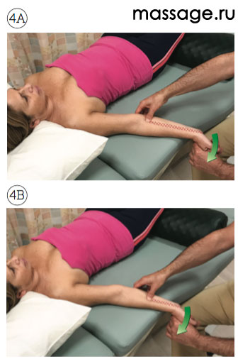 На рис. 4А-4В показан способ применения техники точечного растягивания на лучевом сгибателе запястья (указаны два возможных фокуса приложения силы).