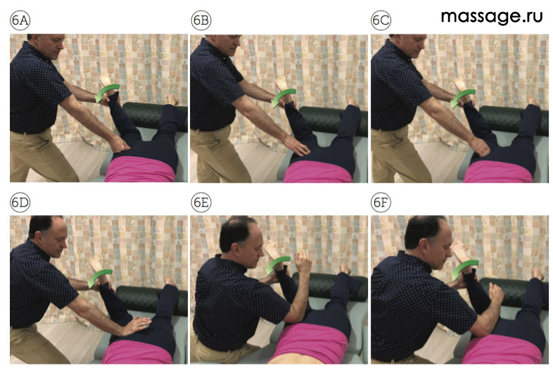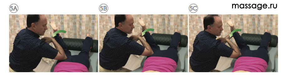 На рис. 5А-5В показан способ применения этой техники для растягивания грушевидной мышцы (указаны три возможных фокуса приложения силы).