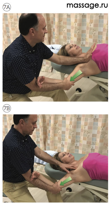 Иногда особенности тела клиента ограничивают возможности использования разных частей тела терапевтом. Рис. 7А-7В демонстрируют технику точечного растягивания правой малой грудной мышцы. Используя запястье для создания фокуса, как на рис. 7А, терапевт может испытывать неудобства в связи с необходимостью удерживать запястье в напряжении во избежание контакта с грудью клиента (по этическим соображениям). Поэтому, в данном случае уместнее будет применить пальцевое прижатие (Рис. 7В).