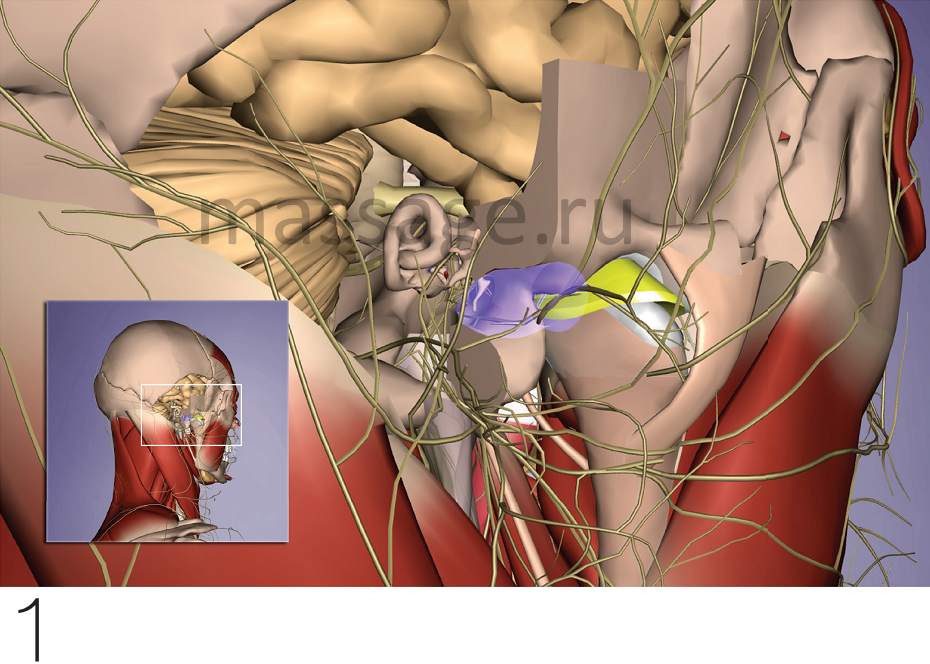 Одна из причин такого разнообразия симптомов – соседство височно-нижнечелюстного сустава с нервными волокнами. На рис.1 видно, что ВНЧС (выделен желтым) располагается в непосредственной близости от слухового нерва и черепно-мозговыми нервами. На рис.2 изображен срез черепа на уровне ВНЧС. Слуховые каналы выделены фиолетовым цветом, а ВНЧС – желтым.