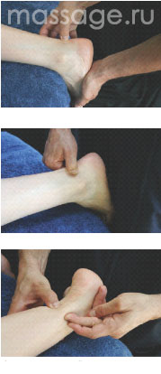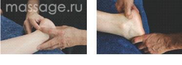 Положение то же самое, что и при фрикциях передней части сухожилия. Поместите ваши указательные пальцы на пяточный бугор, большие пальцы расположите под пяткой. Сильно надавите и оттяните данную область указательными пальцами, аккуратно двигая предплечьями из стороны в сторону.