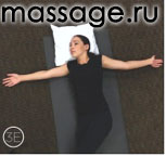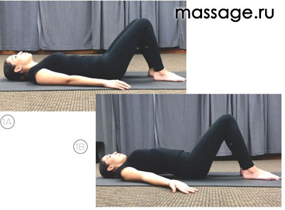 Лягте на пол, согните ноги в коленях, поставив стопы на пол на ширину бёдер, вытяните руки вдоль туловища ладонями вниз (Рис.1А). На вдохе сделайте поступательное движение тазом вверх, создавая прогиб в пояснице, упираясь копчиком в пол. Разверните кисти ладонями вверх (Рис. 1В). На выдохе вернитесь в исходное положение. Прогибаясь в пояснице, наклоните голову вперёд, растягивая шею, стараясь достать подбородком груди. Медленно повторяйте упражнение на протяжении пяти минут.