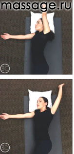 Лягте на бок, согните ноги в коленях, вытяните руки перед грудью ладонями друг к другу (Рис.3А). Подложите под голову подушку, чтобы снять нагрузку с шейных позвонков. Пальцами руки, лежащей сверху, «пробегитесь» по полу, сначала создав угол 45 градусов, после – 90, оставив руку за головой (Рис.3B-3D). Затем создайте руками развернутый угол, образовав руками и телом форму буквы «Т» (Рис.3E). Такими же шагами верните руку в исходное положение. Развернитесь на другой бок, и проделайте то же самое другой рукой. Следите за тем, чтобы подушечки пальцев касались пола, даже если вам приходится сильно изгибать локоть. Делайте вдох, когда заводите руку за спину, и выдыхайте, когда возвращаете её обратно в положение перед грудью. Старайтесь не напрягаться и выполнять упражнение медленно и подконтрольно.