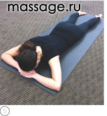 Лягте на живот на пол, положите лоб на сложенные перед головой ладони или запястья (Рис.5). Сконцентрируйтесь на дыхании. Оставайтесь в таком положении от полутора до трёх минут. Для удобства подложите валик или подушку под бёдра и разведите ноги шире. Чтобы усложнить упражнение, сведите ноги вместе.