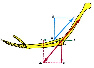 Рис. 2 . Схема действия 'пары сил' (по М. Ф. Иваницкому). ав - равнодействующая двуглавой мышцы плеча; дж - противодействие со стороны плечевой кости; аб - 'полезная' составляющая двуглавой мышцы плеча; аг - другая составляющая той же мышцы, способствующая давлению предплечья на плечо в локтевом суставе; де - составляющие силы давления плечевой кости на предплечье; ад - плечо пары сил, из которых одна сила аб, а другая - де. Благодаря работе пары сил сокращение двуглавой мышцы плеча способствует сгибанию в локтевом суставе