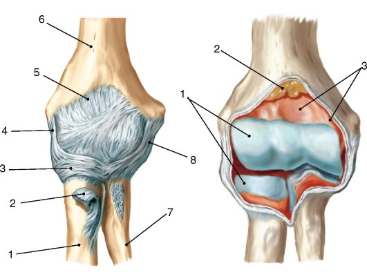а - наружный вид: 1 - лучевая кость; 2 - сухожилие двуглавой мышцы плеча; 3 - кольцевая связка лучевой кости; 4 - лучевая коллатеральная связка; 5 - капсула сустава; 6 - плечевая кость; 7 - локтевая коллатеральная связка; 8 - локтевая кость; б - капсула сустава удалена: 1 - суставной хрящ; 2 - жировая ткань; 3 - синовиальная мембрана