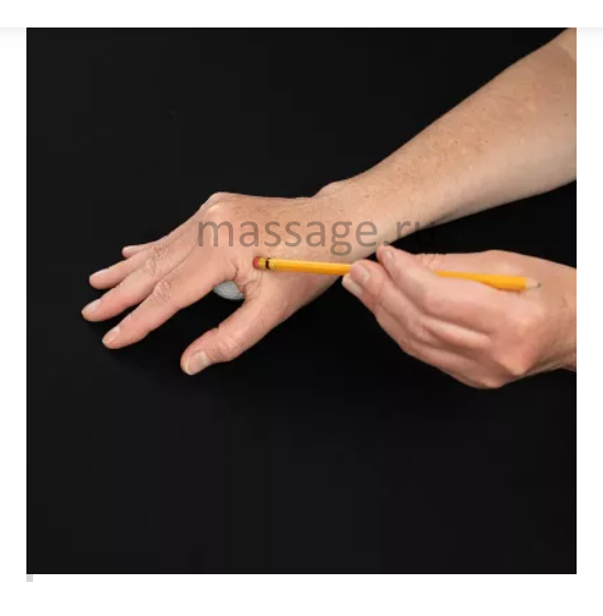 - Чтобы расслабить мышцу, приводящую большой палец (adductor pollicis), поддерживайте кисть и мягко надавливайте на нужную область, используя, например, ластик на конце карандаша (Рис. 1). Удерживайте давление 30-60 секунд.