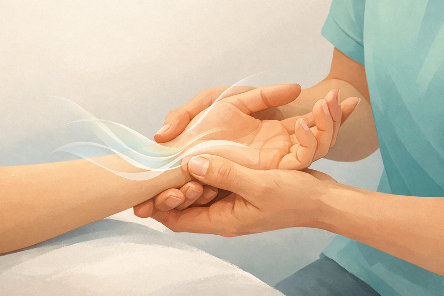 - Тракция и работа с сопротивлением. Используя большие пальцы как «крючки», выполните мягкую, но устойчивую тракцию (вытяжение) всей руки. Удерживая натяжение, попросите клиента медленно попытаться согнуть кисть (ладонное сгибание), преодолевая ваше сопротивление. Удерживайте напряжение на 5 счетов.