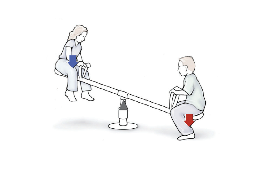 Рычаги первого рода имеют точку опоры, расположенную между точками приложения сил. Простейший пример рычага первого типа – детские качели (См. Рис.1). Твёрдая балка расположена на точке опоры. Если два человека сядут на противоположные концы рычага такого типа, они смогут балансировать на центральной оси, или один может подняться выше другого. Задача рычага такого типа – баланс.