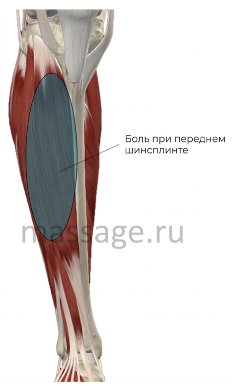 Передний шинсплинт: окажите умеренное давление на мышцы передней поверхности голени и попросите клиента выполнить тыльное сгибание стопы с преодолением вашего сопротивления. Если этот маневр вызывает боль, на которую изначально и жаловался клиент, это с высокой долей вероятности указывает на поражение мышц, отвечающих за тыльное сгибание.