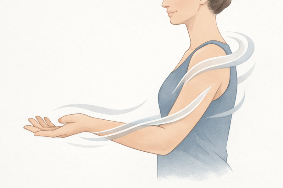 - Исходное положение. Встаньте или сядьте, выпрямив спину. Сохраняйте нейтральное положение позвоночника, тянитесь макушкой в потолок. Прочувствуйте, как вытягивается шея (грудь расправлена, подбородок не опускайте, а слегка подайте назад). Положение руки. Опустите расслабленную руку вдоль туловища. Разогните запястье (потяните кисть на себя), широко растопырив пальцы. В этот момент вы можете ощутить покалывание в большом, указательном и среднем пальцах – это признак мягкого натяжения срединного нерва. Ротация и отведение. Если вы не испытываете дискомфорта и готовы продолжать, выполните вращение руки наружу в плечевом суставе (супинацию) так, чтобы пальцы разогнутой кисти смотрели назад. Затем плавно отведите руку в сторону от корпуса примерно на 15–20 градусов.