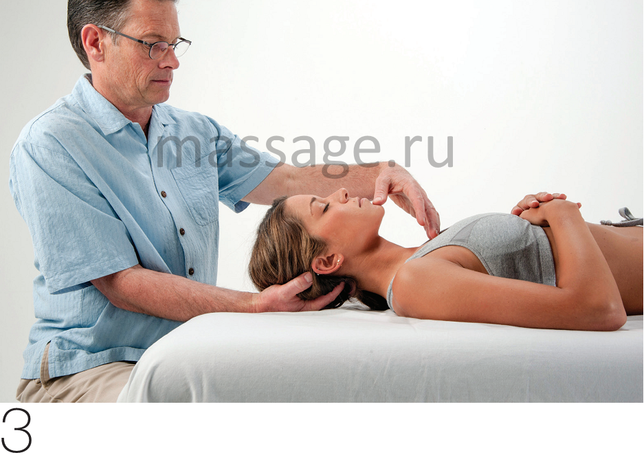 • Вариант «Подковы» (Рис.4): очень осторожно обхватите затылок и нижнюю челюсть ладонями, образовав «подкову». Попросите клиента расслабиться, открыть и закрыть челюсти, одновременно обращая внимания на любые препятствия. Не делайте никаких дополнительных движений, не растягивайте и не двигайте – клиент сам должен открывать и закрывать челюсть.
