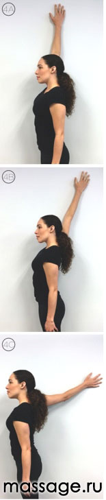 Встаньте боком к стене. Вытяните руку вверх и коснитесь стены внутренней стороной ладони. Представьте, что вы стоите внутри циферблата часов, а ваша рука – это стрелка, указывающая на двенадцать часов (Рис.4А). Медленно, не отрывая ладони от стены, перемещайте свою руку по часовой стрелке. Вы ощутите, как растягиваются мышцы спины и кора, почувствуете напряжение в мышцах шеи. Медленно передвигайте руку на три глубоких вдоха.