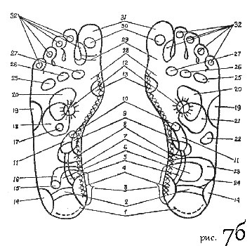 Проекции органов и участков тела на поверхность-стоп: 1 — седалищный нерв; 2 — органы малого таза; 3 — пояснично-крестцовая область; 4 — мочевой пузырь; 5 — мочеточник; 6 — тонкая кишка; 7 — поперечная ободочная кишка; 8 — поджелудочная железа; 9 — желудок; 10 — надпочечник; 11 — почка; 12 — солнечное сплетение; 13 — щитовидная железа; 14 — суставы нижней конечности; 15 — аппендикс; 16 — восходящая кишка; 17 — желчный пузырь; 18 — печень; 19 — суставы верхней конечности; 20 — легкое; 21 — сердце; 22 — селезенка; 23 — нисходящая кишка; 24 — сигмовидная и прямая кишка; 25 — ухо; 26 — глаз; 27 — глотка, гортань; 28 — шея; 29 — мозг; 30 — гипофиз; 31 — голова; 32 — околоносовые пазухи, зубы; 33 — позвоночный столб.
