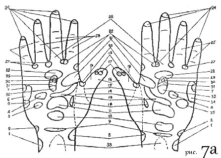 Проекции органов и участков тела на ладонную поверхность: 1 — яичко, яичник; . 2 — суставы нижней конечности; 3 — аппендикс; 4 — поджелудочная железа; 5 — желчный пузырь; б — печень; 7 — суставы верхней конечности; 8 — наружные половые органы, матка, предстательная железа; 9 — геморроидальные узлы; 10 — мочевой пузырь; 11 — кишки; 12 — щитовидная железа; 13 — ободочная кишка; 14 —позвоночный столб; 15 — шея; 16 — психическая сфера; 17 — гипофиз; 18 — эпифиз; 19 — голова, мозг; 20 — глотка, гортань; 21 — желудок; 22 — глаза; 23 — нервная система; 24 — околоносовые пазухи; 25 — слух; 26 — зрение; 27 — уши; 28 — легкое; 29 — тимус; 30 — солнечное сплетение; 31 — надпочечники; 32 — почка; 33 — пояснично-крестцовая область; 34 — сердце; 35 — селезенка.